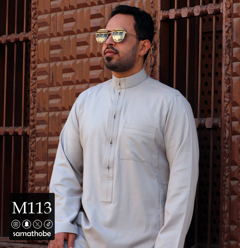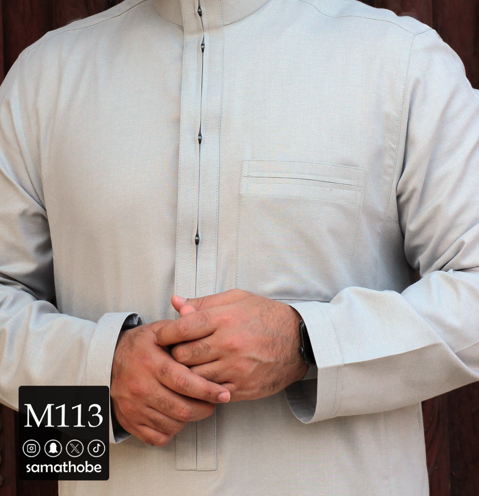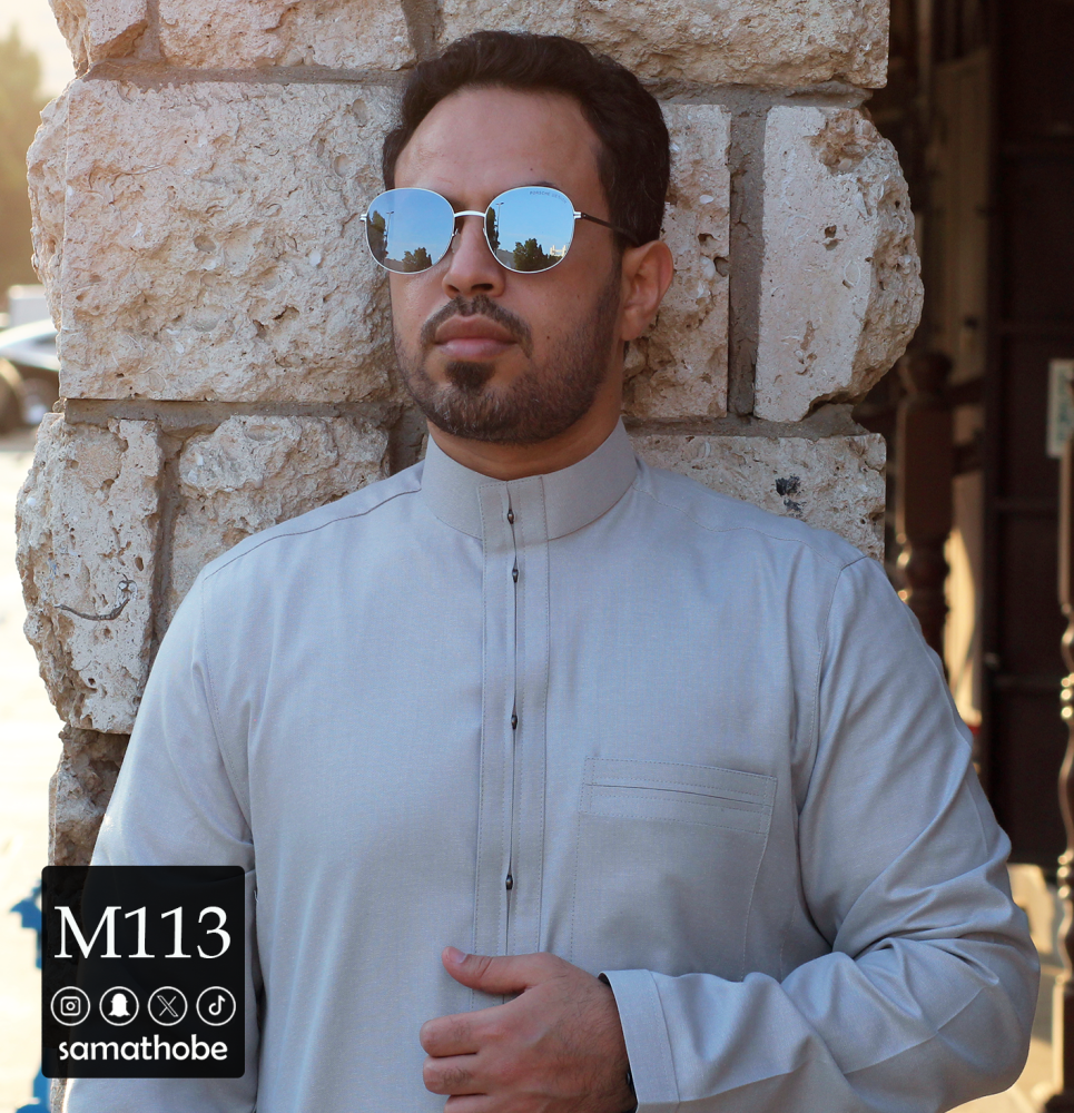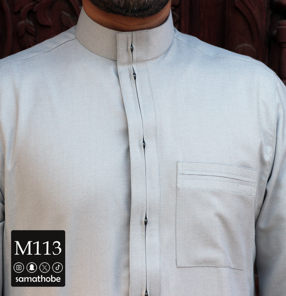 قماش قطن 30% لون رمادي خفيف وصيفي وتصميم مختلف وغريب في الجبزور واضافه زرار معدني بطريقة مميزة